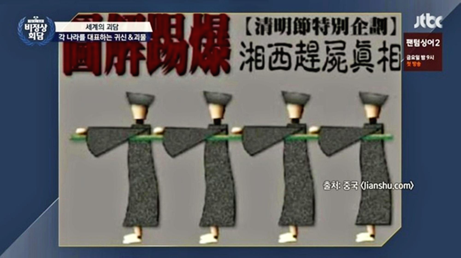 우선 가장 유명한 것은 우리나라 JTBC의 인기 프로그램이었던 비정상회담에서 중국인 패널인 왕심린이 강시에 대해 설명을 한 적이 있는데, 청나라시대에 전쟁으로 사망한 시신들을 고향으로 옮기기 위해 고안해 낸 방법으로, 시신의 양쪽 겨드랑이에 긴 대나무 막대 2개를 끼우고 줄로 엮은 후, 양 끝을 두 사람이 짊어지고 운반하는 방벙에서 나왔다는 이야기가 있습니다.